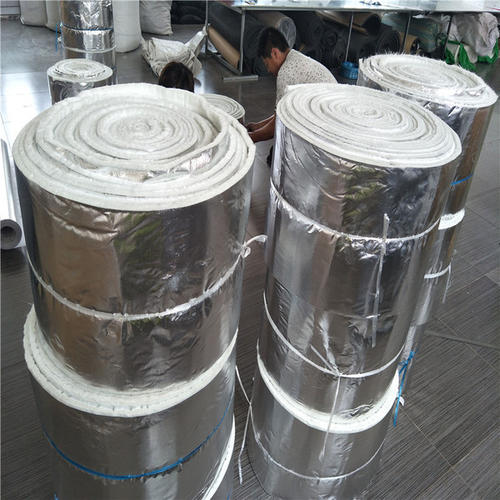 云緯覆鋁箔針刺毯是在現(xiàn)有陶瓷纖維計刺毯的基礎(chǔ)上利用專用機(jī)械,通過專用粘結(jié)劑將金屬鋁箔平整地覆到針刺毯表面形成的一種復(fù)合產(chǎn)品。由于在針刺毯表面增加了一層致密 的金屬鋁箔層,有效屏蔽了熱量透過纖維毯向空氣的對流,對輻射熱量形成有效反射,從而極大地提高了產(chǎn)品的絕熱性能。