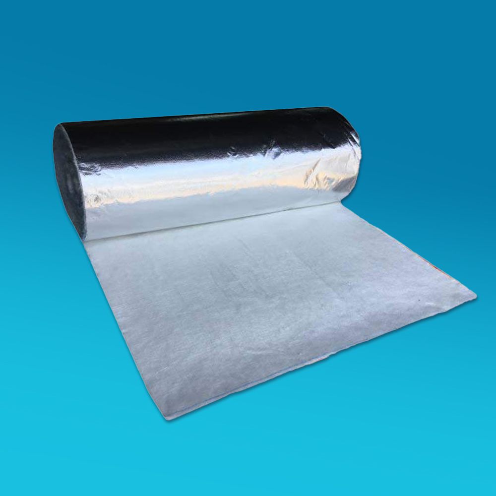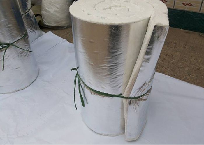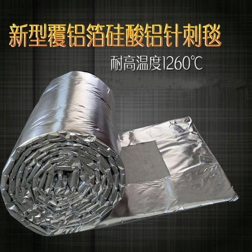 云緯覆鋁箔針刺毯是在現(xiàn)有陶瓷纖維計刺毯的基礎(chǔ)上利用專用機械,通過專用粘結(jié)劑將金屬鋁箔平整地覆到針刺毯表面形成的一種復(fù)合產(chǎn)品。由于在針刺毯表面增加了一層致密 的金屬鋁箔層,有效屏蔽了熱量透過纖維毯向空氣的對流,對輻射熱量形成有效反射,從而極大地提高了產(chǎn)品的絕熱性能。